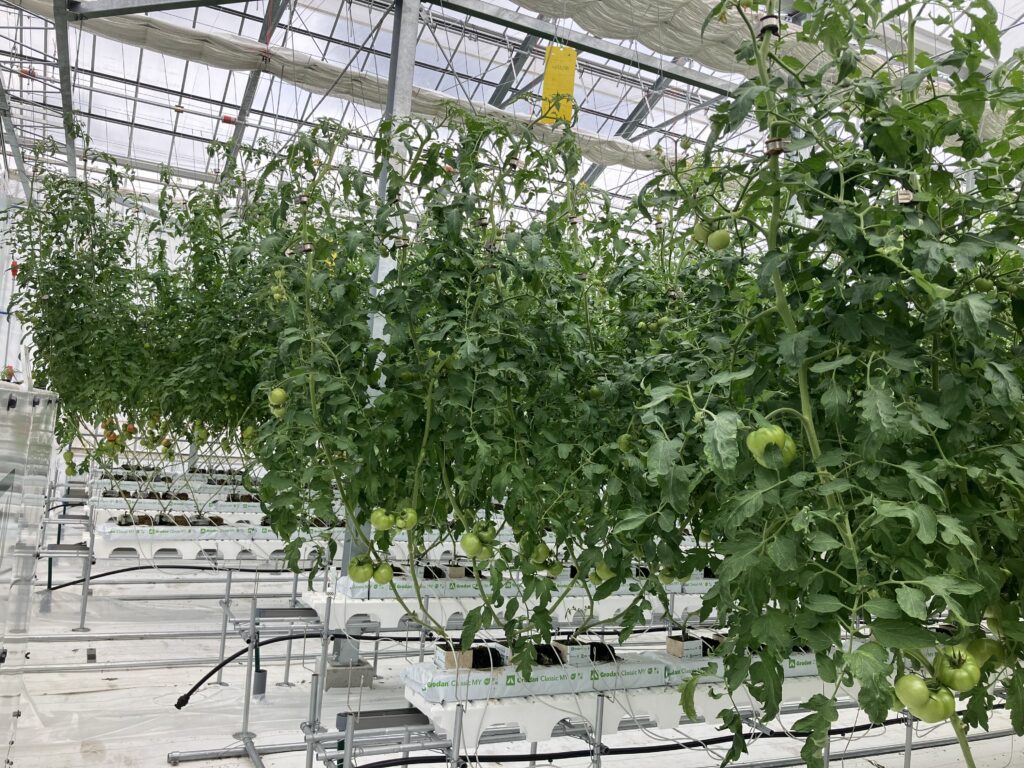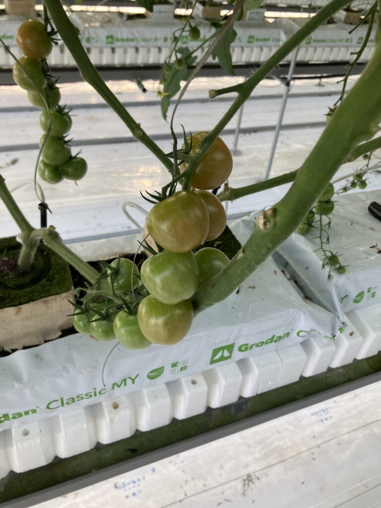 トマトは、大中小のサイズがあり、高さが2メートル以上に育ちました。緑の実がたくさんついていますが、ところどころ赤く、色ずいてきました。温室の中では、クラシック音楽が流れています。、店頭に並ぶのが楽しみです。