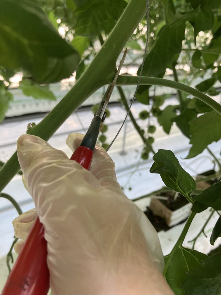9月に、植えられたトマトの苗の、葉を下から4枚づつ、切り落とす作業をしています。